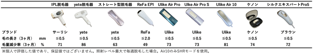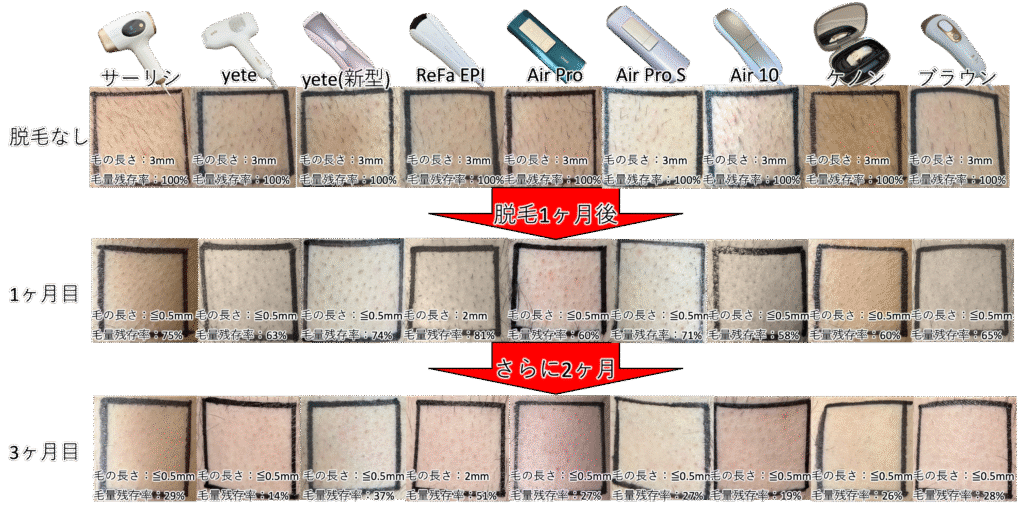 - 全ての脱毛器で毛量が減少(脱毛効果あり)