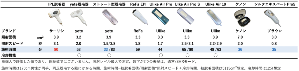 冷却機能付きで、照射面積が大きく、照射スピードの速い脱毛器ほど施術時間が短くなります