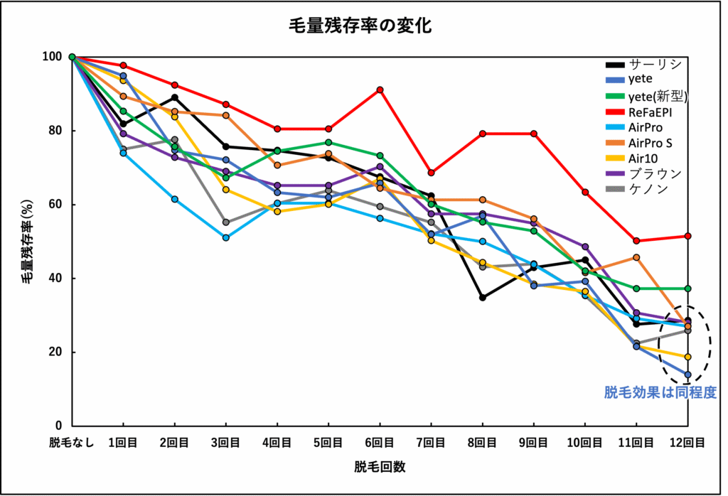 図3. 9種類の脱毛器で脱毛続けた際の経過(検証部位:太もも。脱毛範囲:3.5cm×3.5cm).